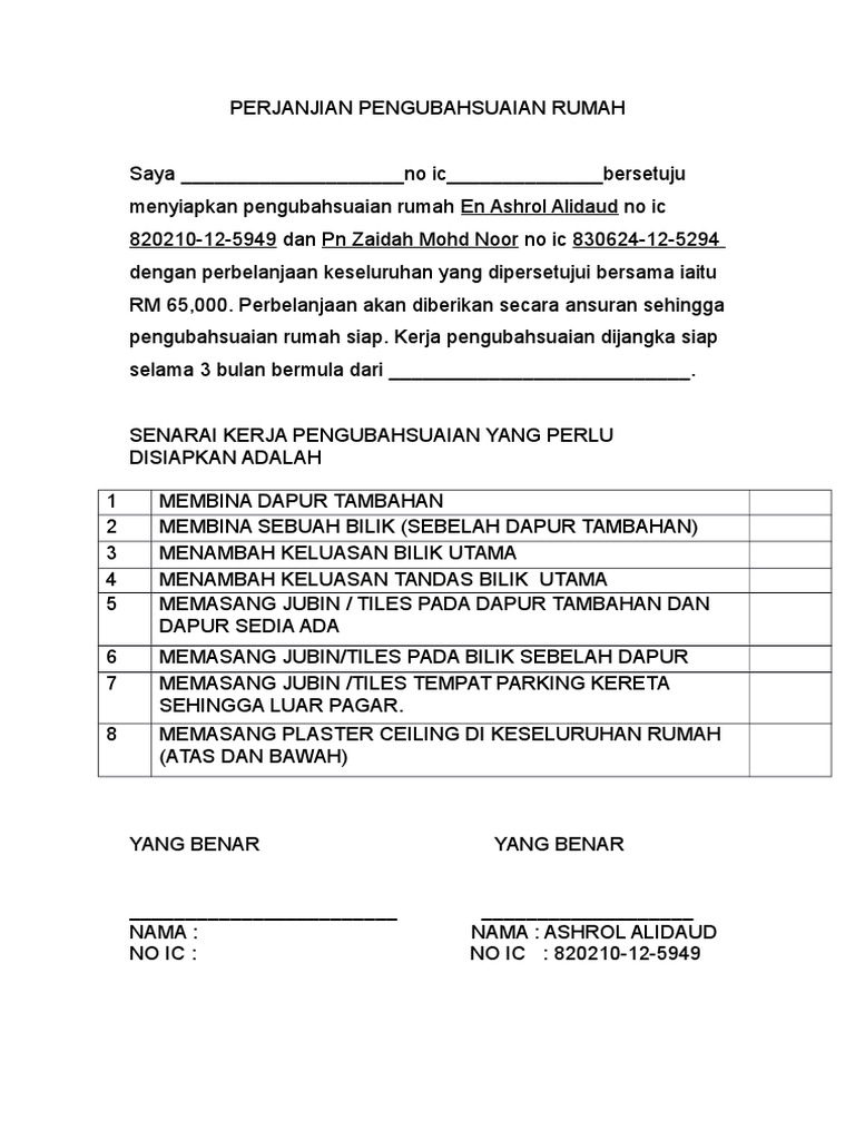 Surat Perjanjian Ubahsuai Rumah Pdf